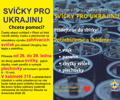 Útoky na ukrajinskou infrastrukturu vedly k black-outům a chladu, kdy přes milion lidí trpí výpadky elektřiny i v mrazech pod -20 °C. V Obchodní akademii v Plzni sbíráme od 26. do 29. ledna v kabinetu 315 zbytky svíček, vosk, [...]