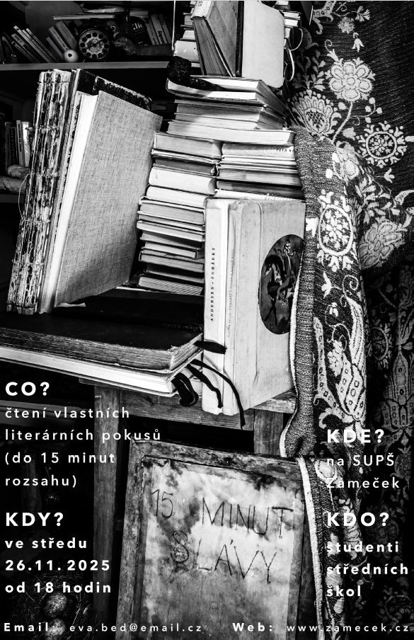 Ve středu 26. listopadu 2025 se ve vestibulu SUPŠ Zámeček konala soutěž v autorském čtení 15 minut slávy. Žáci Obchodní akademie Plzeň se soutěže zúčastňují pravidelně, v tomto ročníku bylo ovšem jejich zastoupení mimořádné – naši školu reprezentovala rovná pětice žáků (Adéla Nováková, Kristýna Taichmanová, Ina Martanová, Kateřina Levá a Petra Hořanová). Přestože jsme na nejvyšší příčky nakonec nedosáhli, dařilo se nám držet krok s nejlepšími a texty, které na akci zazněly, svědčí o velkém literárním talentu všech zúčastněných.