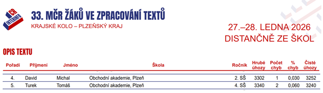 Naši žáci se tradičně zúčastnili Mistrovství ČR v psaní na klávesnici, kterou pořádá společnost ZAV a INTERINFO ČR. Online se zapojilo 89. soutěžících. Přestože naši nejlepší nedosáhli na příčky nejvyšší, jejich výkon je obdivuhodný. Děkujeme za vynikající reprezentaci školy.