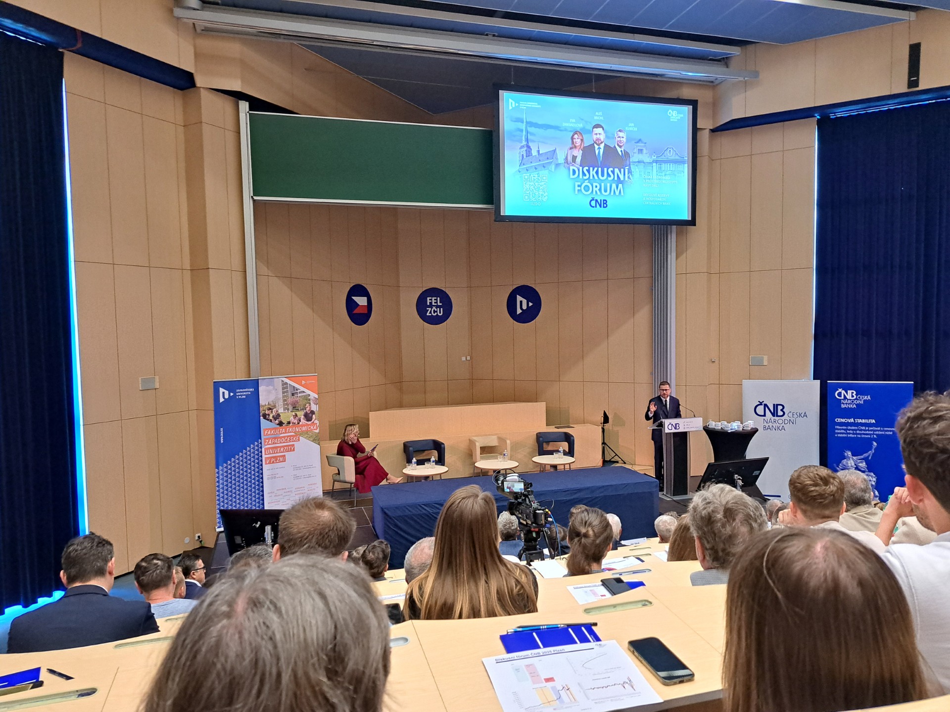 Představte si svět, kde algoritmy a technologie pomáhají, ale hodnoty nás drží pevně na zemi. Česká ekonomika v prostředí nejistoty: Kudy dál? Devizové rezervy a hospodaření centrálních bank. To byla jedna z hlavních témat „Diskusního fóra ČNB“, které bylo uspořádáno právě ČBN ve spolupráci se Západočeskou univerzitou v Plzni. O výsledcích práce bankovní rady ČNB, vývoji tuzemské ekonomiky v prostředí globální nejistoty či devizových rezervách a hospodaření centrálních bank diskutovali se studenty guvernér České národní banky Aleš Michl, víceguvernérka Eva Zamrazilová, člen bankovní rady Jan Kubíček a další ekonomové.